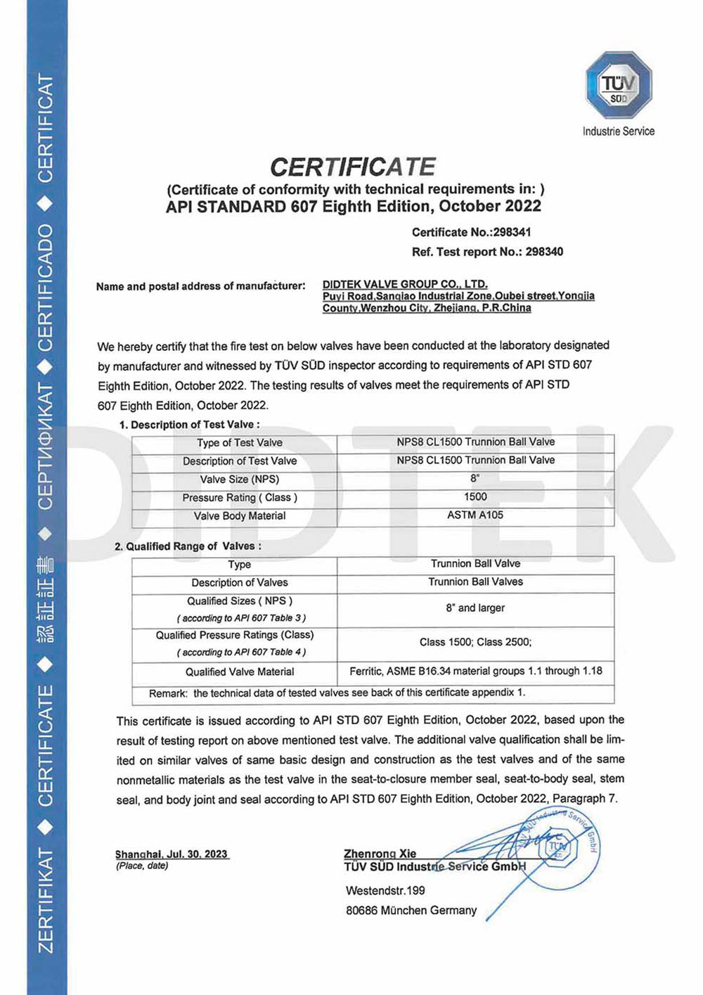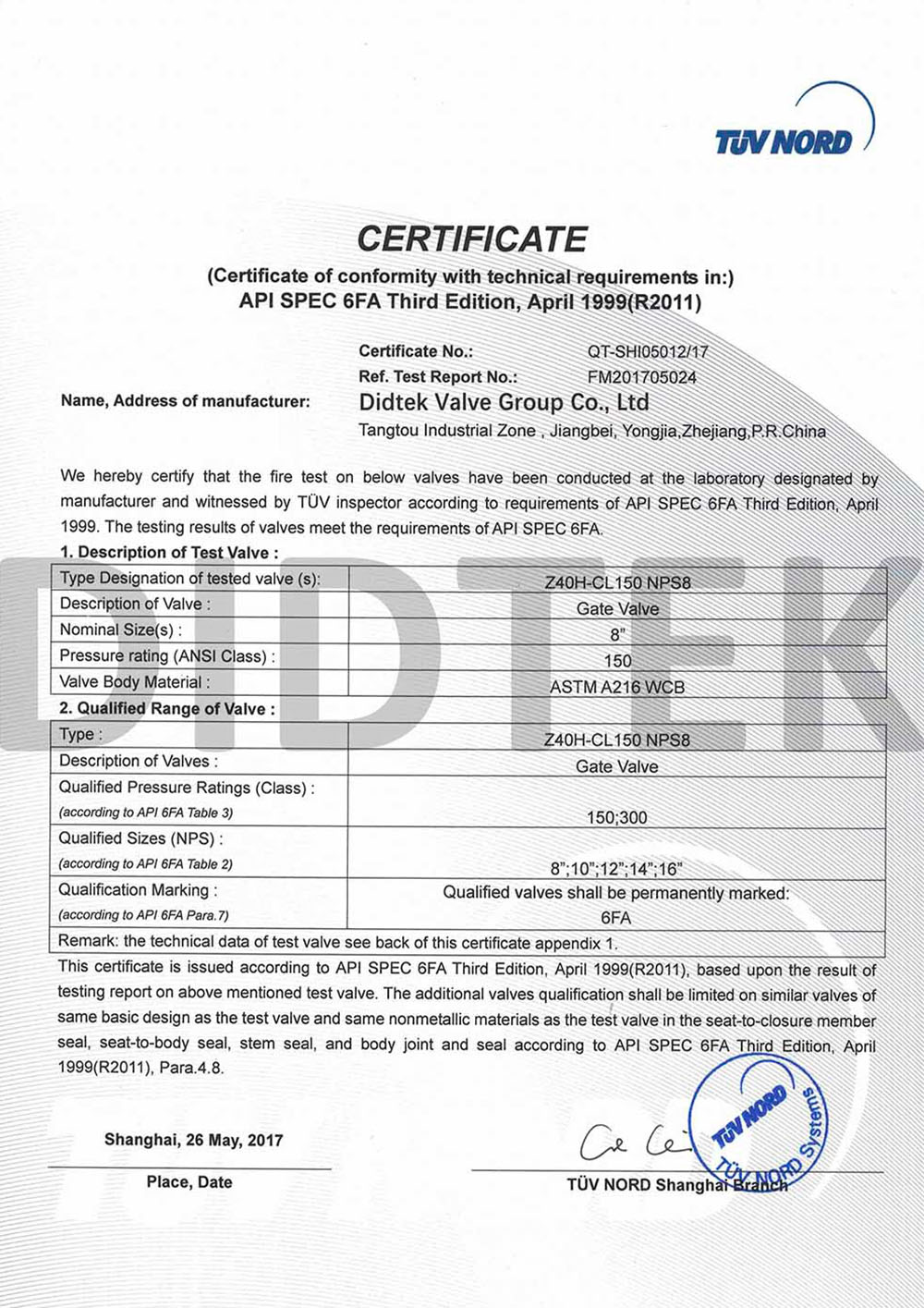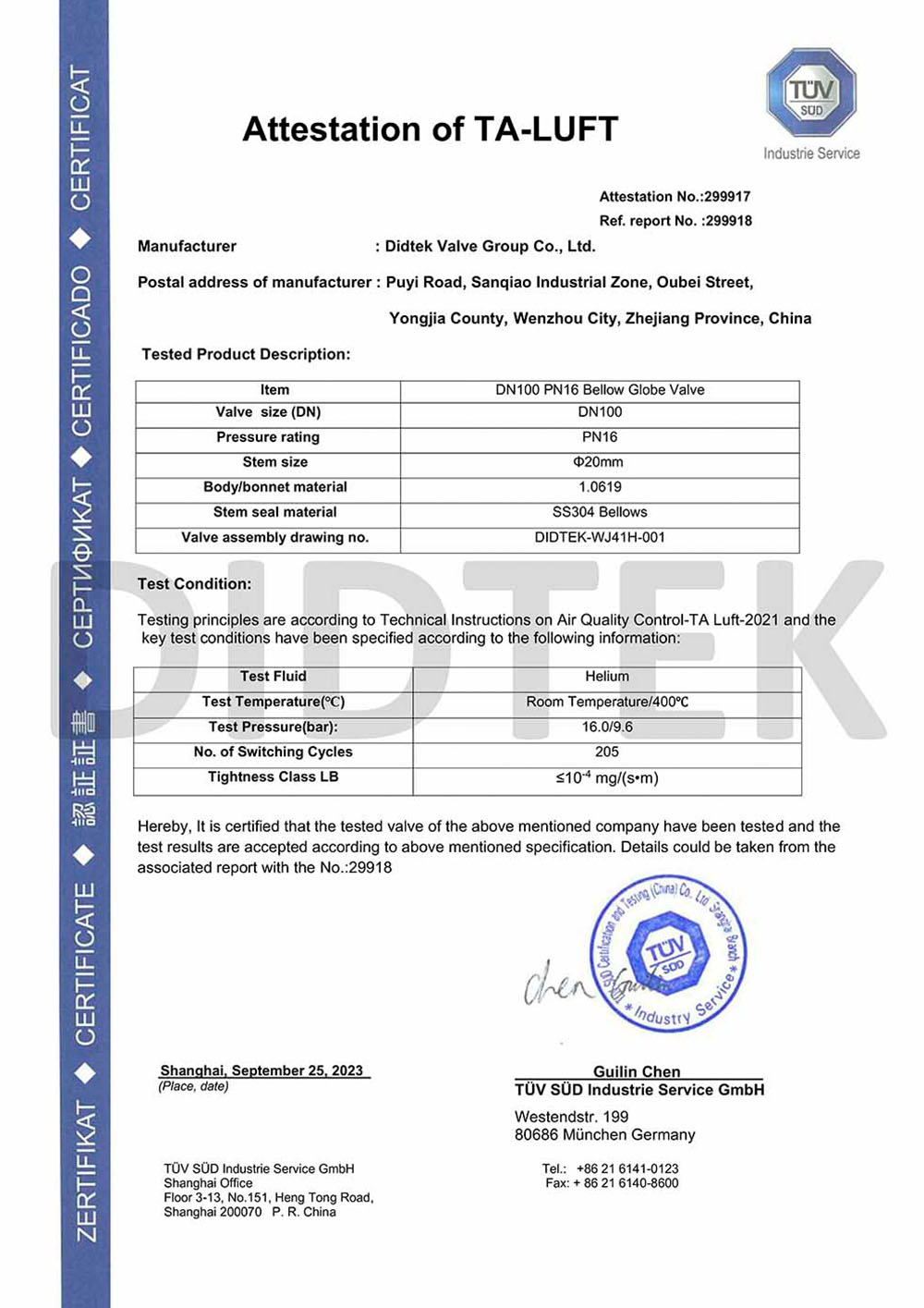 Al fine di migliorare il riconoscimento del marchio ed espandere la quota di mercato del marchio DIDTEK, la nostra azienda ha ottenuto varie certificazioni professionali sia a livello nazionale che internazionale. Queste certificazioni includono la licenza di produzione di attrezzature speciali TS China, certificazione di test del tipo di attrezzatura speciale, certificazione del sistema di gestione della qualità ISO 9001, certificazione API 6d American Petroleum Institute 6D, Lloyd's Register LRV CE Certificato EU 0343 PED Modello H, Regno Unito (Regno Unito) UKCA Sicurezza UKCA Certificazione, certificazione Russia Customs Union (EAC), certificazione di emissione fuggitiva della valvola Ta-Luft, ISO 15848 Valve Fugitive Certificazione Micro-Leakage di emissione, certificazione API 607 ​​Fire, certificazione API 6FA Fire e altri. Queste certificazioni forniscono una solida base e garanzia per la promozione del marchio Didtek.